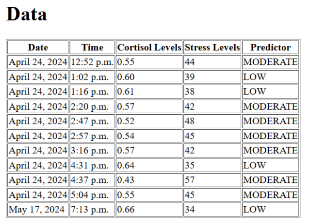 Once the readings are obtained, they serve as inputs to a prediction algorithm model. This model is pivotal in predicting whether an individual is experiencing high levels of stress, as stress weakens the immune system and renders individuals more susceptible to viral infections. Our Django-based dashboard plays a crucial role in visualizing these predictions. We’ve integrated the system seamlessly by implementing code that triggers the IR LED and collects the photodiode readings. Initially, the readings are taken for the empty box before every trial so that environmental bias is removed, prompting the user to insert the sample after the initial calibration is done. Subsequently, the system collects readings for a specified duration before halting. This data feeds into the machine learning model, and the resulting predictions are displayed on a webpage accessible via a link generated by the IDE upon command execution. The dashboard provides insights to the users on their susceptibility to viral infections based on stress levels. This implementation not only combines hardware and software components but also harnesses the power of machine learning and web development to offer a comprehensive solution for predicting and visualizing stress-based viral infection susceptibility (Figures 4-6).