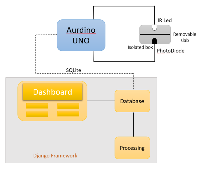 Figure 3 shows the block diagram representation of the suggested prototype. The hardware implementation uses components like an Arduino Uno microcontroller, an IR LED, and an IR sensor. The dashboard for the prototype, where all the data is displayed in a user-friendly manner, is built using the Django framework. SQLite is used to build the database.