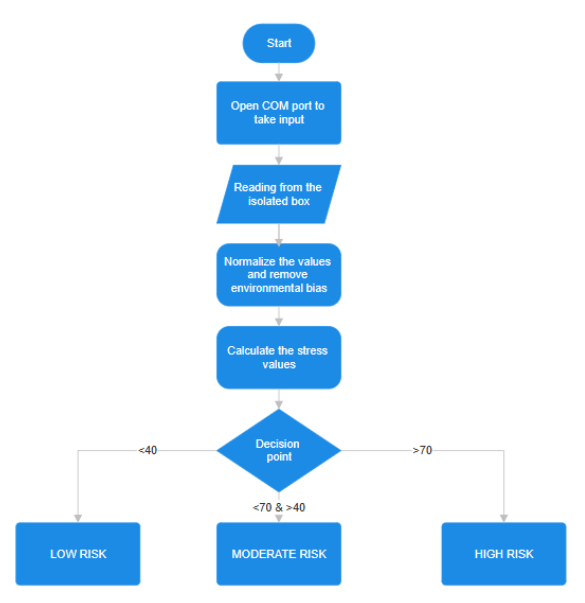 Figure 7 shows the flow diagram of the program to insert data. The program starts with opening the COM port to get serialized input from Arduino, and then it proceeds to process it by normalizing it and removing the environmental bias for that setup. After the cortisol values have been normalized, the relative stress levels are calculated by taking the complement. Finally, the prediction is made based on the stress values. The prediction algorithm takes into consideration the stress levels of the previous two days to give a verdict.