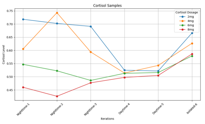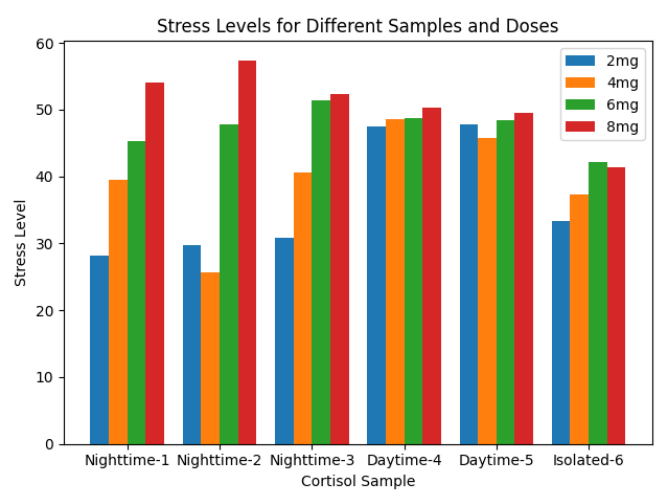 As expected, the stress levels for the 8 mg of cortisol concentration are the highest, and the stress levels for the 2 mg of cortisol concentration are the lowest.